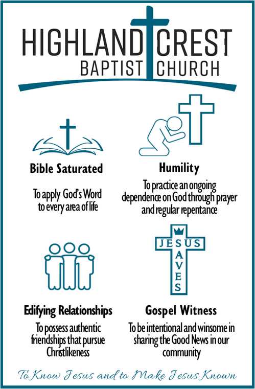 The vision of Highland Crest Baptist Church is to create a community of authentic believers that are Bible Saturated, Humble in Prayer & Repentance, Working to Edify Relationships that pursue Christlikeness and to be Intentional and Winsome in sharing the Good News in our Community.